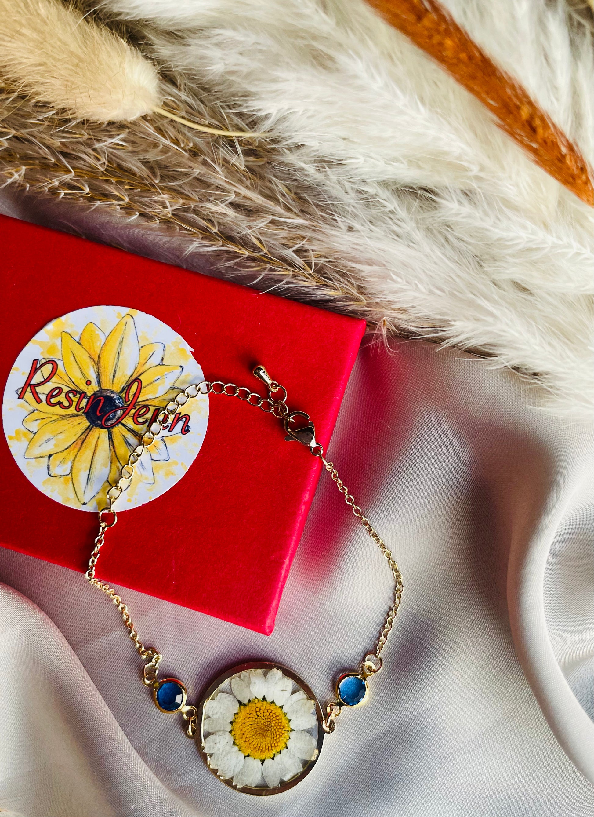Stunning gold bracelet with real pressed white daisy. 2 sapphire gemstones đÂ