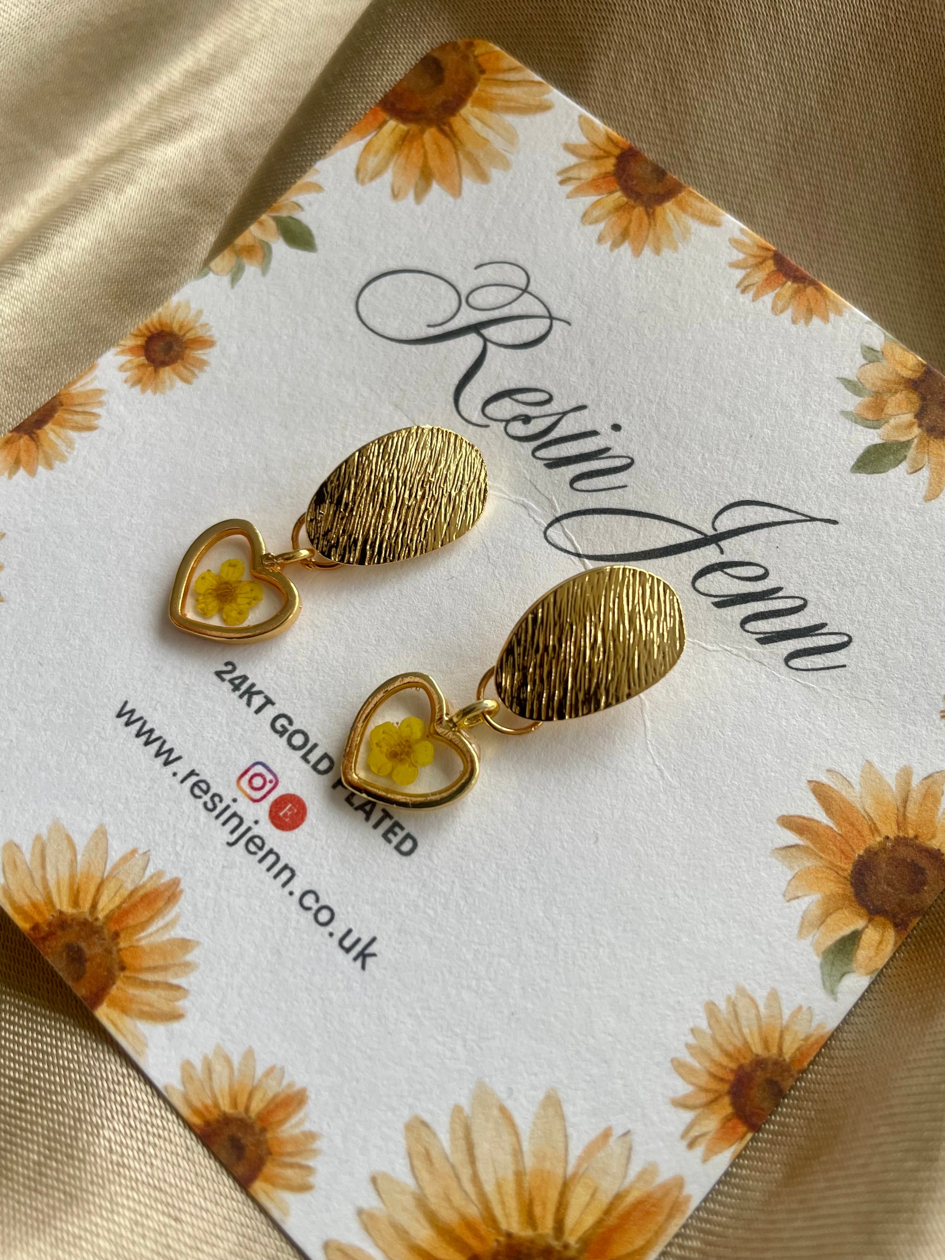 Gold plated dangle earrings with dried flower added. Preserved tiny yellow blossom flower